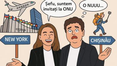 Într-o sală mare, cu drapele și pahare de cristal, s-a așezat o delegație românească, plină…